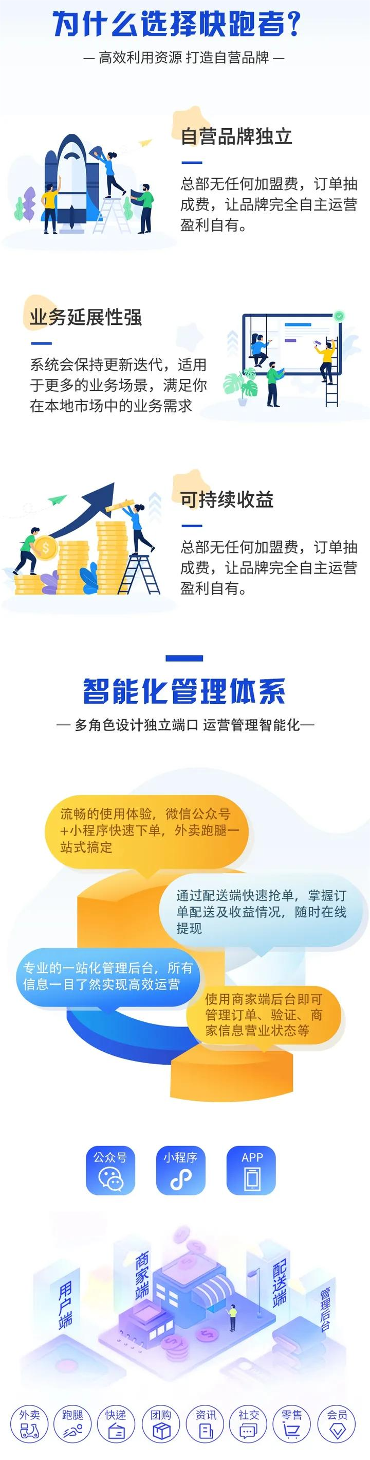 快跑者满足同城外卖、团购、拼团、发现、推广分销、同城小程序、会员权益卡、跑腿功能、信息发布等多样化功能,帮助解决创业者难题。